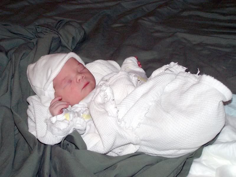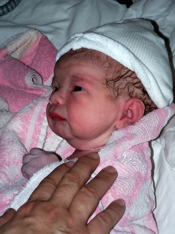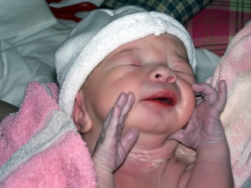 Needless to say, this pregnancy and birth has been a spiritual growth experience. I have prayed for years to get my "spiritual gift" of complaining under control. I whined for awhile when the itch first kicked in but just had to get used to it. I read Supernatural Childbirth and the idea of a pain-free childbirth experience sounded incredibly enticing! Oh, how I prayed. Learning not to question God was another growth opportunity as it became apparent that my labor was going to, indeed, be painful. I figured God, the Creator of the Universe, was still in control and I’ve been through this before. Then THE PAIN started causing difficulty in even walking. My hips are still messed up – time for the chiropractor. The pain was SO HARD to push against and my midwife and friend had me breathing through the "pushy" contractions while she waited for the other midwife to show up. I was in so much pain I would start crying which caused my DH and mom to cry which worried my 4 older daughters who were with us. But what a blessing when my buddy, Nan, stopped everybody to pray and they held hands around the bed and covered me with prayer. I was in pain but not worried. This birth was as much a miracle as a pain-free birth because Craig and I had come to a place of despair and could turn nowhere but the Lord. I could not request an epidural or a c-section for a quick rescue (although I knew we had a gun in the garage attic for hunting and thought about asking Craig to go get it) ;o) As Craig said, this was the "prayinest " we’ve been through. He prayed over me the whole time.